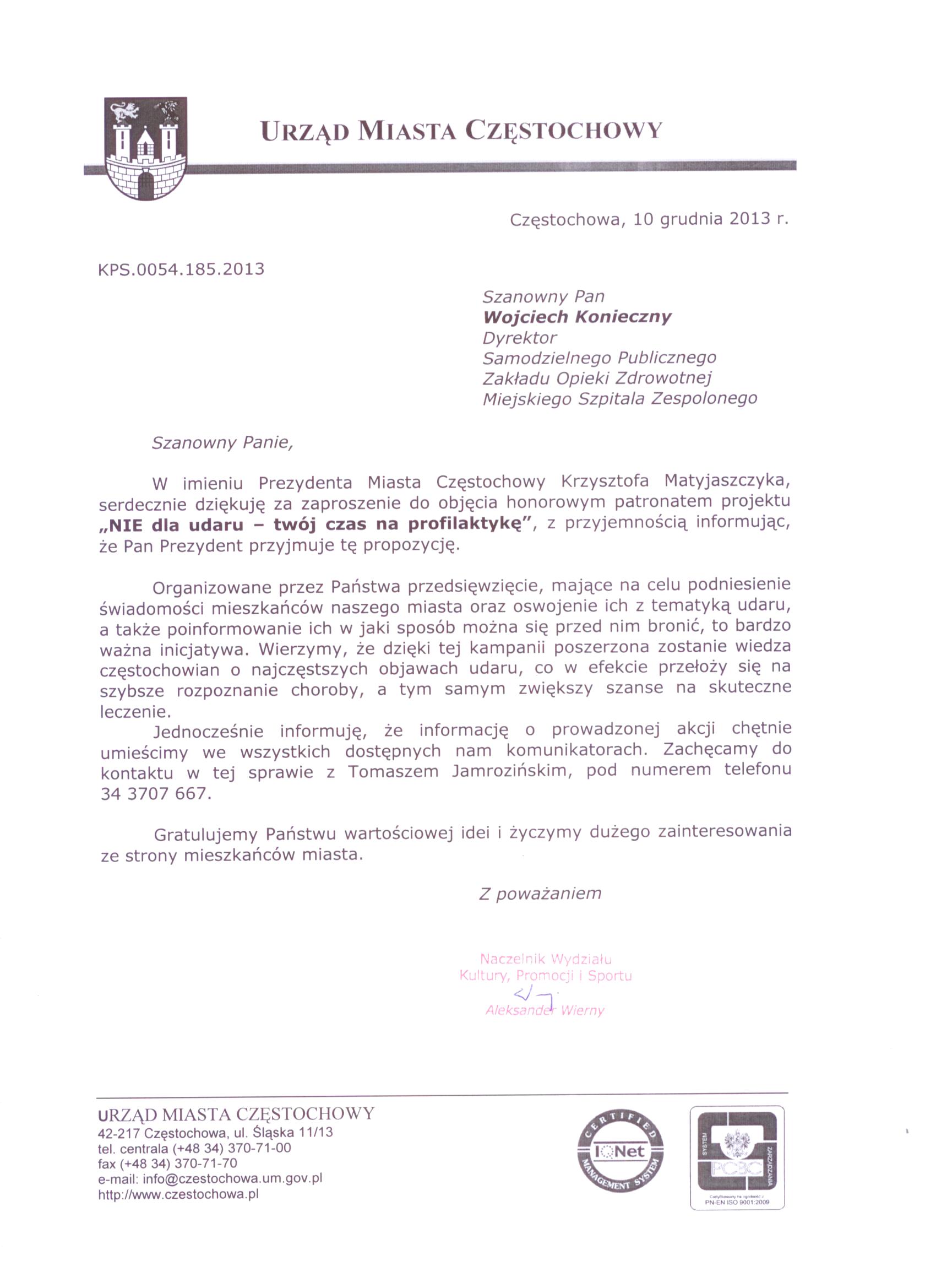 17 grudnia, 2013 Miejski Szpital Zespolony Brak komentarzy Mamy przyjemność poinformować, że patronat nad organizowaną przez Miejski Szpital Zespolony kampanią „NIE dla udaru – twój czas na profilaktykę” przyjął Prezydent Miasta Częstochowy Krzysztof Matyjaszczyk.